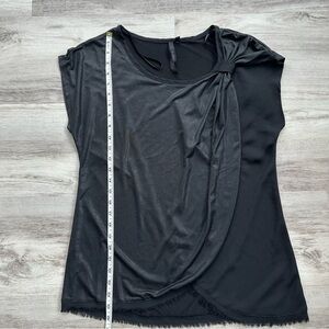 Chic black blouse with elegant draped front. Perfect for versatile styling.