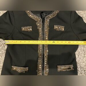 Chic black jacket with gold beaded accents. Stylish and versatile for any occasion.