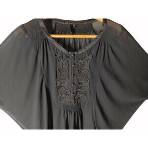 Bellatrix Black Sheer Embroidered Boho Blouse Size L Button Detail Flowy Boho