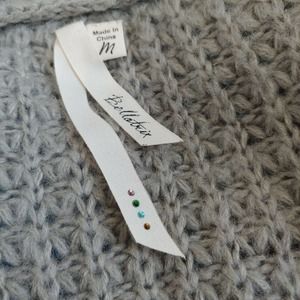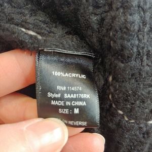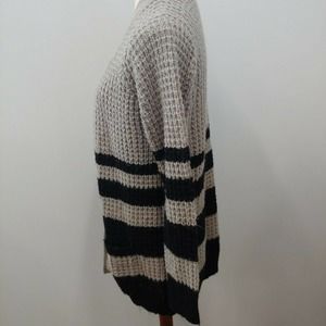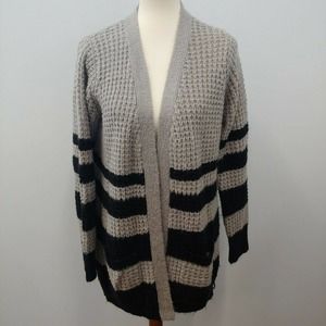 This is an open front black and gray striped chunky knit cardigan from Bellatrix in a size medium. It has 2 front pockets.