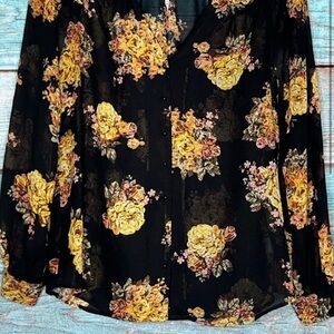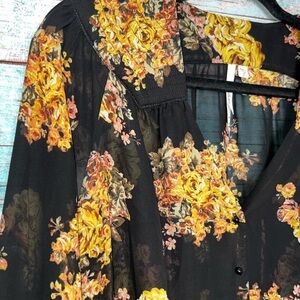 Bellatrix brand dress top. Size small. Semi-sheer, silky feel material. Black with floral print. Button front style. Quilted details on shoulders & sleeve hem. Beautiful office blouse. Also looks great with jeans. Preloved. Please see all photos for condition. A bit oversized. Flowy, relaxed fit. Slightly curved hem.