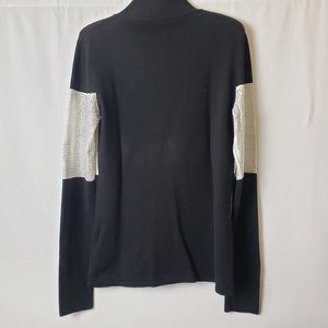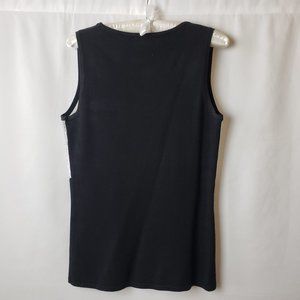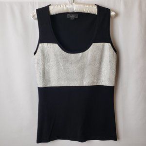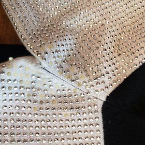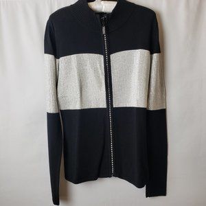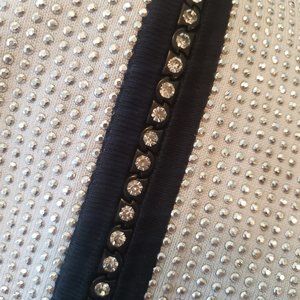 Embellished silver reflective round bead with flat top and rhinestone zipper on cardigan.Tank top and zip up cardigan 78% Viscose and 22% Nylon.Viscose is a great lightweight material, lustrous finish soft feel.Hand washing do not wring.Turn inside out and cool iron as needed. Has flaws under the arm pits intermittently missing embellishment-other than that no other flaws. See pics for details I purchased at a boutique in Scottsdale Arizona.Gently worn and freshly dry cleaned.