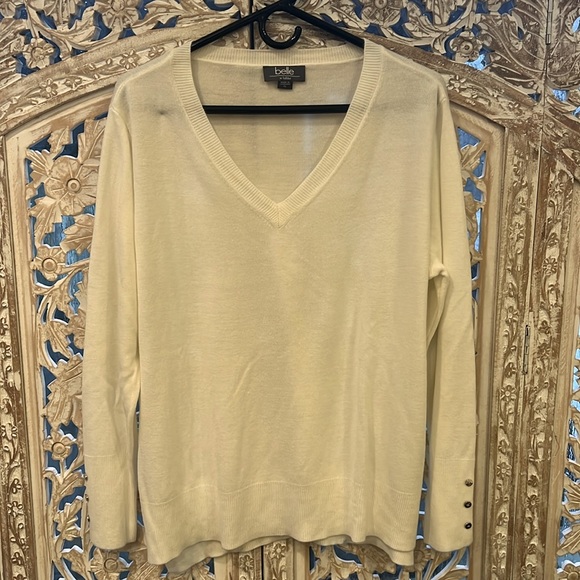 Cream neck, long sleeve sweater. Three silver buttons on each sleeve 100% acrylic