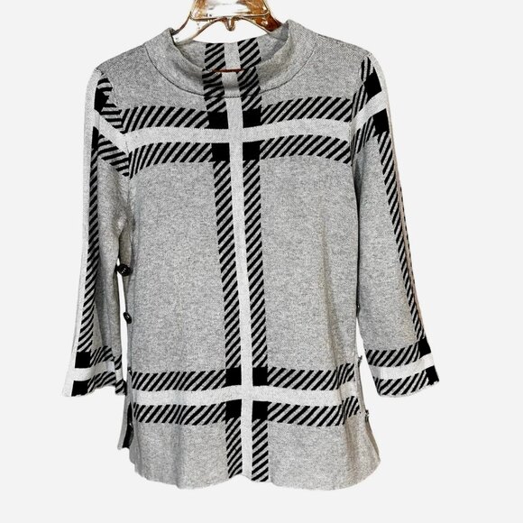 Belldini Plaid Mock Neck Sweater M Gray Black White 3/4 Sleeve Quiet Luxury Knit