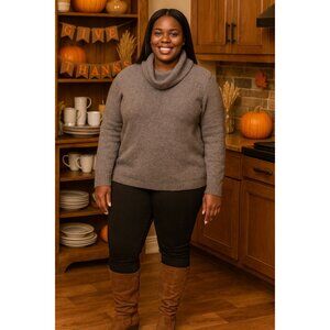 taupe sweater, plus size sweater, cowl neck pullover, women's knitwear, cozy taupe top, soft knit sweater, winter sweater, long sleeve knit, casual taupe sweater, relaxed fit sweater, warm women's sweater, plus size pullover, acrylic blend sweater