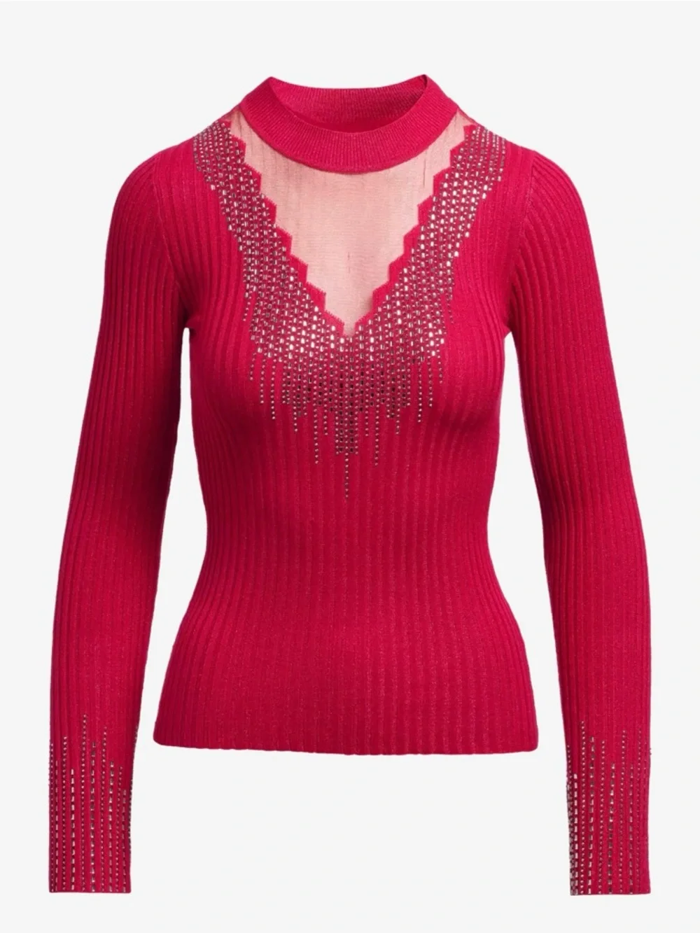 Sheer mesh at the neckline is framed by hand-placed rhinestones that catch every flash of light. A sleek, fitted silhouette and slim long sleeves keep it chic, while extra stone detailing at the cuffs adds a playful finish.