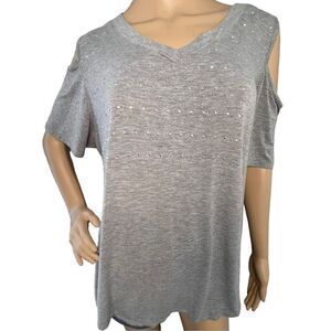 Belldini Short Sleeve V-Neck Blouse With Exposed Shoulder and Sequins