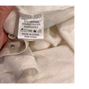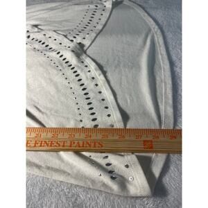 Chic and flattering, this Belldini white cowl neck top in size Small features sparkling silver-tone embellishments and laser-cut details. Made from a soft, stretchy knit blend with a draped neckline and a feminine silhouette. A perfect glam touch for holiday, evening, or date night wear. Good preowned condition. There is a mark on the bottom back near hem and one on the back of the right sleeve. Could possibly come out with spot treatment. See photos.