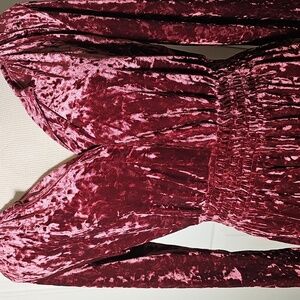 This elegant romantic, whimsy goth velvet dress features a rich red hue, perfect for any occasion. The long sleeves and gathered waist add a touch of sophistication. Ideal for evening wear or special events. Size medium Petite. The pit to pit flat measurement is 21". The waist flat measurement not stretched is 15". The sleeves are about 18". The top to bottom length is about 50". Consider making a bundle and get an even better offer and save on shipping.