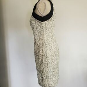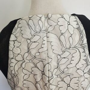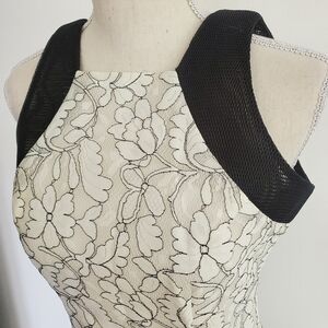 Gorgeous Belle Badgley Mischka black and white lace dress with cool black mesh shoulders, back zipper. Perfect for a bridal shower or other events!