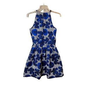 Belle Badgley Mischka Blue Floral Pattern Striped Background Sleeveless High Neck Fit And Flare Dress US/CA 2 EU 34 UK 6 GER 32 AUS 6 MEX 2