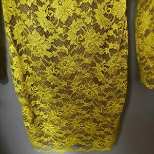 This is a Badgley Mischka Belle knee length dress. It is very stretchy and form fitting. It is a bright yellow lace with a nude lining. It has a zipper closure and a retro feel.