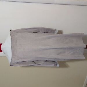 Dove gray and powder blue come together to create this buttery soft faux suede Duster from Belle Badgley Mischka. Overall EUC; a few tiny ink spots on back of the right elbow (pictured); does not effect the beauty of this piece.