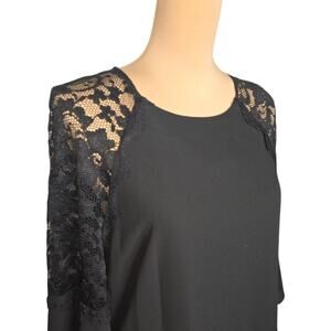 Black midi shift dress with lace details on shoulders and bell 3/4 length sleeves.