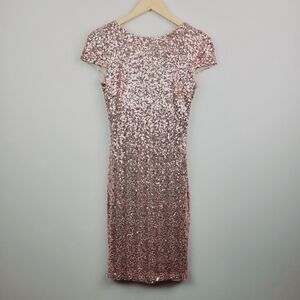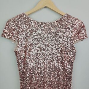 Belle Badgley Mischka. Size 10. Blush Pink, Rose Gold. Allover Sequin Detail. Cap Sleeve. Jewel Neckline. Sheath Silhouette. Above-Knee Length. Cowl Back. Hidden Side Zip Closure. Fully Lined. Nylon Blend.