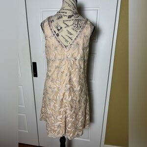Turn heads at your next event in this stunning Badgley Mischka cocktail dress. This sleeveless A-line dress features intricate floral embroidery throughout, adding an elegant and feminine touch to the soft blush-toned fabric. The high neckline is adorned with delicate beadwork, providing a hint of sparkle, while the sheer overlay creates a timeless, ethereal silhouette. Perfect for weddings, formal gatherings, or a night out, this dress combines grace and sophistication, ensuring you make a memorable impression.