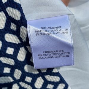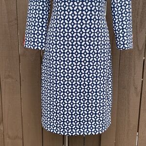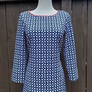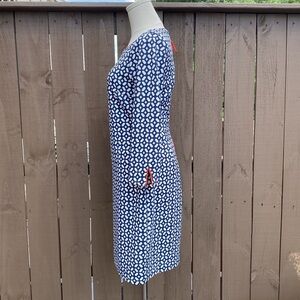 Navy and white Belle Badgley Mischka knee-length shift dress with scoop neck, three-quarter sleeves, exposed back zip closure, orange piping at neckline, back of zip and arm slits, graphic print throughout and white lining.