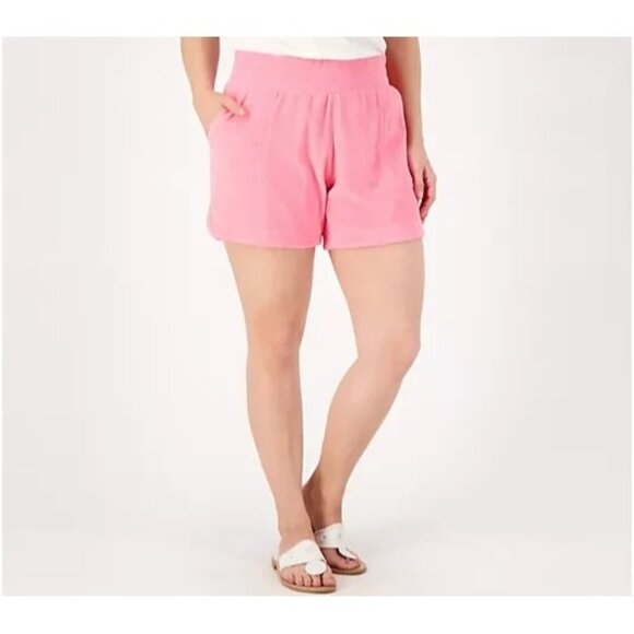 Fabrication: terry clothFeatures: pull-on style, elastic waistband, side pocketsRise: slightly below the waistFit: semi-fitted; follows the lines of the body with added wearing easeLeg Shape: straight leg; falls straight from knee to leg openingInseam: missy/plus inseam 5"Content: 60% cotton/40% polyesterCare: machine wash, tumble dryImported