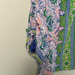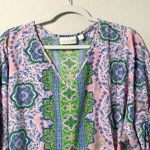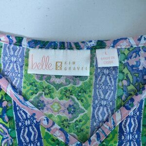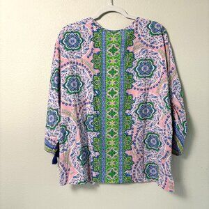 Belle By Kim Gravel Medallion Ruched Sleeve Blouse Size L Pink Green V Neck Boho