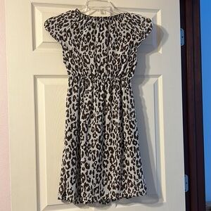 Belle Du Jour Brown & White Leopard Print Dress size juniors Small. Cap sleeve with stretchy cinch under bust. Good condition with small snag on front bottom as pictured in last picture. 100% polyester. Back of neck to bottom is 33 inches long. Armpit to armpit is 15 inches.