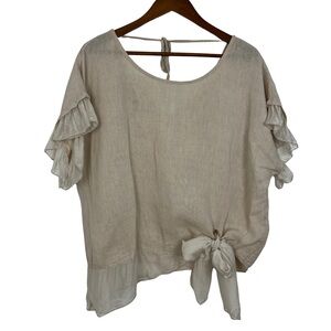 Belle France Beige Linen & Silk Top with Flutter Sleeves and Tie Front Large