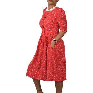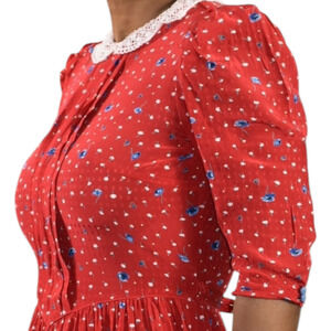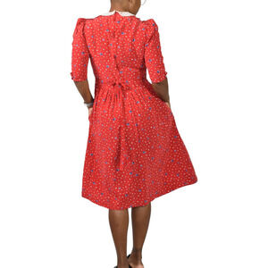 Belle France Dress Red Floral Midi Puff Sleeves Yoked Silky Rayon Vintage Small