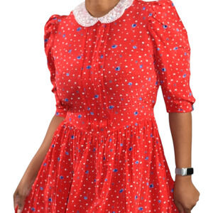 Vintage Jane Schaffhausen Belle France dress FEATURES a crochet lace peter pan collar and a classic fit and flare silhouette. Small floral ditsy pattern. Puff three quarter length sleeves. Pleat detail at center front bodice. Yoked front waist. Flared skirt. Side ties. Zipper back closure. Midi length. Made in USA. ILGWU tag. It is perfect for any occasion, from a casual day out to a special night out.