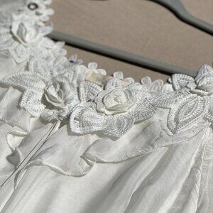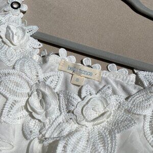 Belle France White Silk Blouse Sheer Sleeves Crocheted Floral Neck Size S
