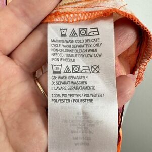 Keywords: Belle by Kim Gravel, blouse, top, long sleeve, abstract print, multicolor, womenswear, casual, bohemian, medium, V-neck, elastic cuff, side slits, pink, orange