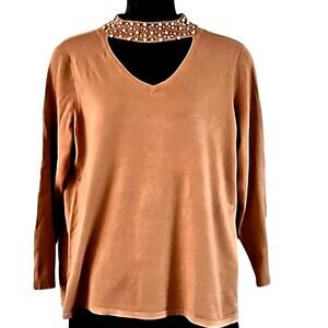 Belle by Kim Gravel sweater, plus size choker sweater, pearl beaded sweater, cut-out neckline sweater, trendy women's top, elegant long sleeve sweater, fashion-forward pullover, soft knit sweater, casual chic, evening wear, holiday fashion, boutique style, statement sweater, luxurious knit top, fashionable plus-size clothing, winter fashion, cozy yet stylish, office casual, dressy top, statement fashion piece.