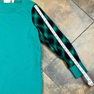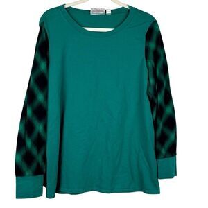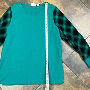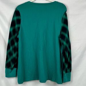 Belle Kim Gravel French Terry Sweatshirt with Plaid Flannel Sleeves Large. There is light staining on the top. Please see all photos. Measurements in photos. In good, pre-loved (used) condition.