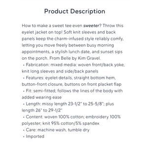 Belle Kim Gravel Size L Creamsicle Eyelet Jacket Knit Sleeves & Back A683209 NWOT