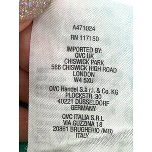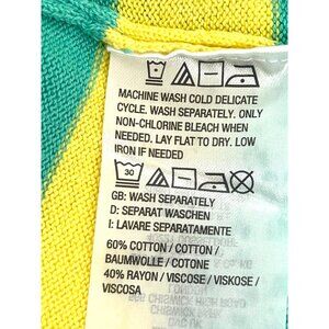 0259B- Belle Kim Gravel woven knit tunic top 1X, QVC, mint green with horizontal stripes in pink, green, yellow, white at chest; yellow stripe at hem area. 3” side slits. Stretchy. Rounded ribbed boat neckline. Ribbed cuffs and hemline. Made in China.