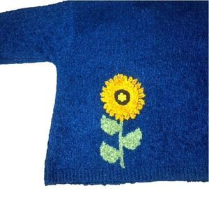 This beautiful Belle Pointe blue vintage sweater is a must-have for any wardrobe! Made from a cozy blend of 42% acrylic, 41% wool, and 17% polyester, this sweater is perfect for chilly days. It features lovely 3D sunflower embellishments and has six fabric-covered buttons, adding a touch of elegance. This sweater is in excellent condition with no visible signs of wear or tear.