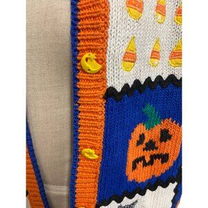 Embrace the spirit of Halloween with this vintage cardigan featuring playful pumpkins, cats, and festive motifs. Crafted from acrylic, it ensures warmth and comfort during cooler seasons. The unique, colorful design adds a touch of whimsy to any outfit, making it an ideal choice for Halloween celebrations or seasonal gatherings.