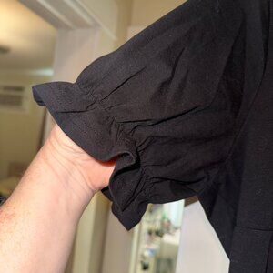 Belle Poque – Black Peasant-Style Ruched Bust Square Neck Puff Sleeve Top (Size 2XL). EUC. This vintage-style short puff elastic ruffle sleeved black top with flattering ruching at the bust is the perfect accompaniment to a swingy circle skirt, retro capris or jeans. Although it is body-hugging, it is made of soft and stretchy cotton fabric, allowing for stretch and ensuring maximum comfort. Bust: 44-47”, Waist: 38-41. Length: 26”. Sleeve Length: 11.6”.
