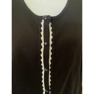 Gently preowned condition Black button-up cardigan with white trim on the placard and around sleeve hem. Size 2-XLarge 65% Viscose / 35% Nylon Measurements are approximate: Pit to PIt - 22" measured flat (44") Length - 23" Sleeve - 24-1/2" No stains, tears, or flaws From a dog-friendly home