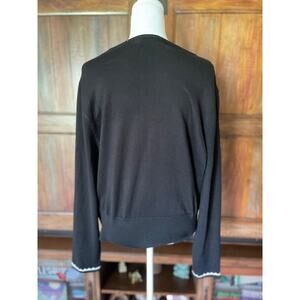 Black button-up cardigan with white trim on the placard and around sleeve hem.