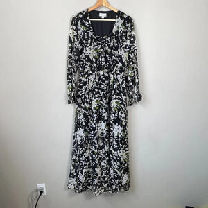 Embrace bohemian beauty with this stunning Belle Sky maxi dress. Featuring a vibrant floral pattern in black, white, and green, this dress is perfect for any occasion, whether it be a wedding, party, or casual outing. The long balloon sleeves and layered ruffle accents add a touch of femininity to the dress, while the V-neckline and collarless design give it a sleek and modern look. Crafted from lightweight chiffon fabric, this dress is both comfortable and stylish. The high waist and adjustable fit and flare design provide a flattering silhouette, while the sheer sleeves and lining add a touch of elegance. Perfect for the summer, fall, or spring season, this dress is a must-have for any fashion-forward woman's wardrobe.