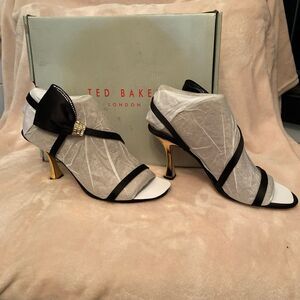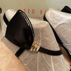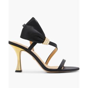 Sparkling embellishments and lustrous hardware accent an asymmetric bow on a soirée-ready slingback sandal lifted by a metallic flare heel.