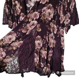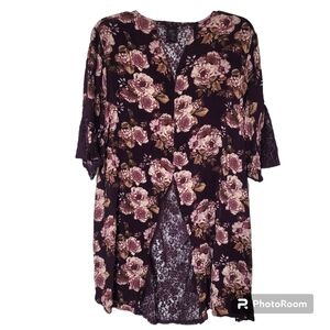 Belle Tweed purple floral open front kimono flowy short sleeve cardigan with lace details