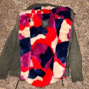 Hood and interior of jacket is lined in magenta, blue, cream, & hot pink faux fur. Drawstring cord runs through bottom of jacket.