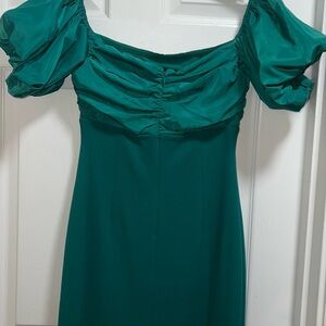 Belle by Badgley Mischka Green dress, specifically the Harlow Stretch Crepe Off-the-Shoulder Puffed Sleeve dress. Size 2 New