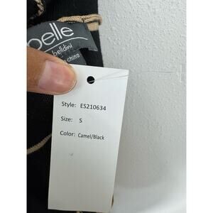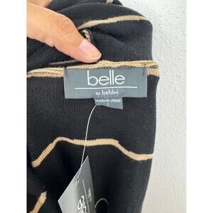 New with tags Belle by Belldini hooded V-neck sweater featuring a modern camel and black stripe pattern. Designed in a soft cotton-viscose knit with a flattering relaxed silhouette and front pocket detail.