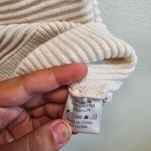 Belle by Belldini pullover sweater in a soft gray-blue and cream colorblock design. Size small, crafted from a rayon/poly/nylon blend for a lightweight yet cozy feel. Features ribbed detailing along the hem and cuffs, diagonal cut colorblock for a modern look, and a classic crew neckline. Perfect for layering with jeans, trousers, or skirts for an effortlessly chic outfit.