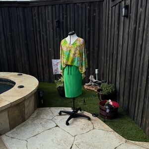 Colorful top with a vibrant leaf design. This pretty poncho-style top will make you feel you stepped onto an island. Its breezy billowy style makes it perfect for beach to bistro. Features green, blue, and pink hues. Ideal for a cheerful style.