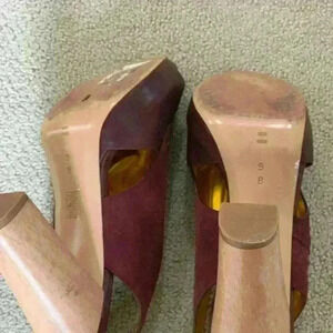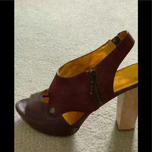 Gorgeous Belle by Sigerson Morrison Burgundy leather and suede open toe high heeled sandals with gold lining. Side zipper. Size US 9B. Used but in great condition. Small nick in toe region of left shoe(see close up image)