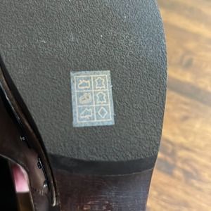 Belle by Sigerson Morrison Platform Wedge Sandal 7.5. The toe to heel measures 10", Heel height is 5" Platform height is 1.5" There is a chip or break at the front of the shoe that has been repaired. I believe these are leather uppers based on the sticker on the bottoms of the shoes. There is a spot on the sole that is coming up, it could be glued back or worn as is. These shoes are in good preowned condition with minor scuffs in the leather as shown in photos.