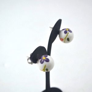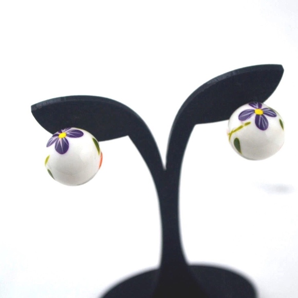 Belle by Sorelle Hand painted Shell Pierced Earrings 14 MM Purple Flowers