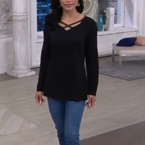 Features: faux-leather trim, long sleeves, V-neckline with faux-leather cross-front detail, straight hem with side slits